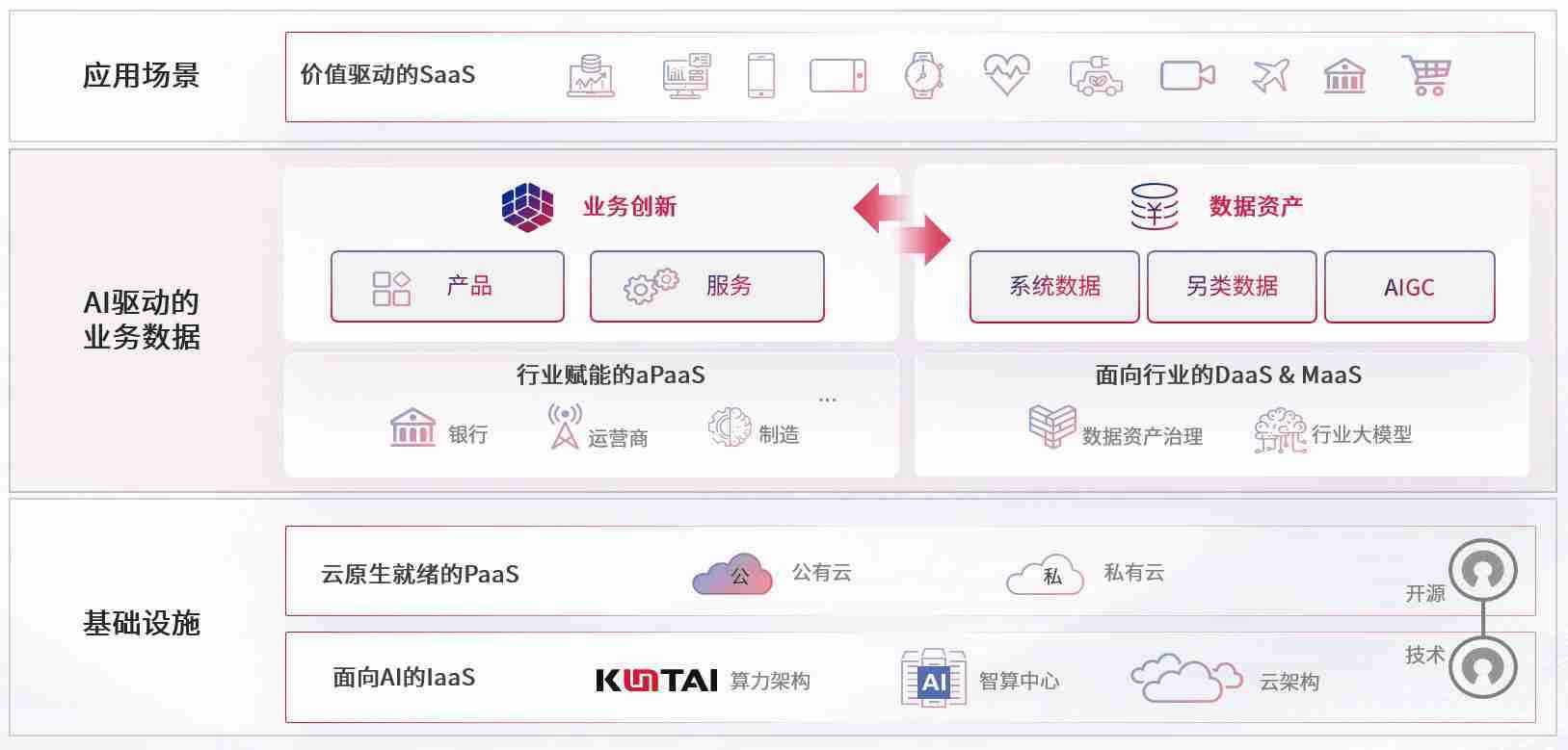 数字时代,,,,围绕企业数字化转型的关键要素,,开云电子数码开创性的提出数云融合战略和技术体系框架,,,着力在云原生、、、数字原生、、、、AI原生和信创产业上架构产品和服务能力,,,为处在不同数字化转型阶段的快消零售、、、汽车、、金融、、、、医疗、、、、政企、、、教育、、、运营商等行业客户提供泛在的敏捷IT能力和融合的数据驱动能力,,,,构建跨界融合创新的数字业务场景和新业务模式,,助力企业级客户建立面向未来的核心能力和竞争优势,,,,全面推动社会的数字化、、智能化转型升级。。。。