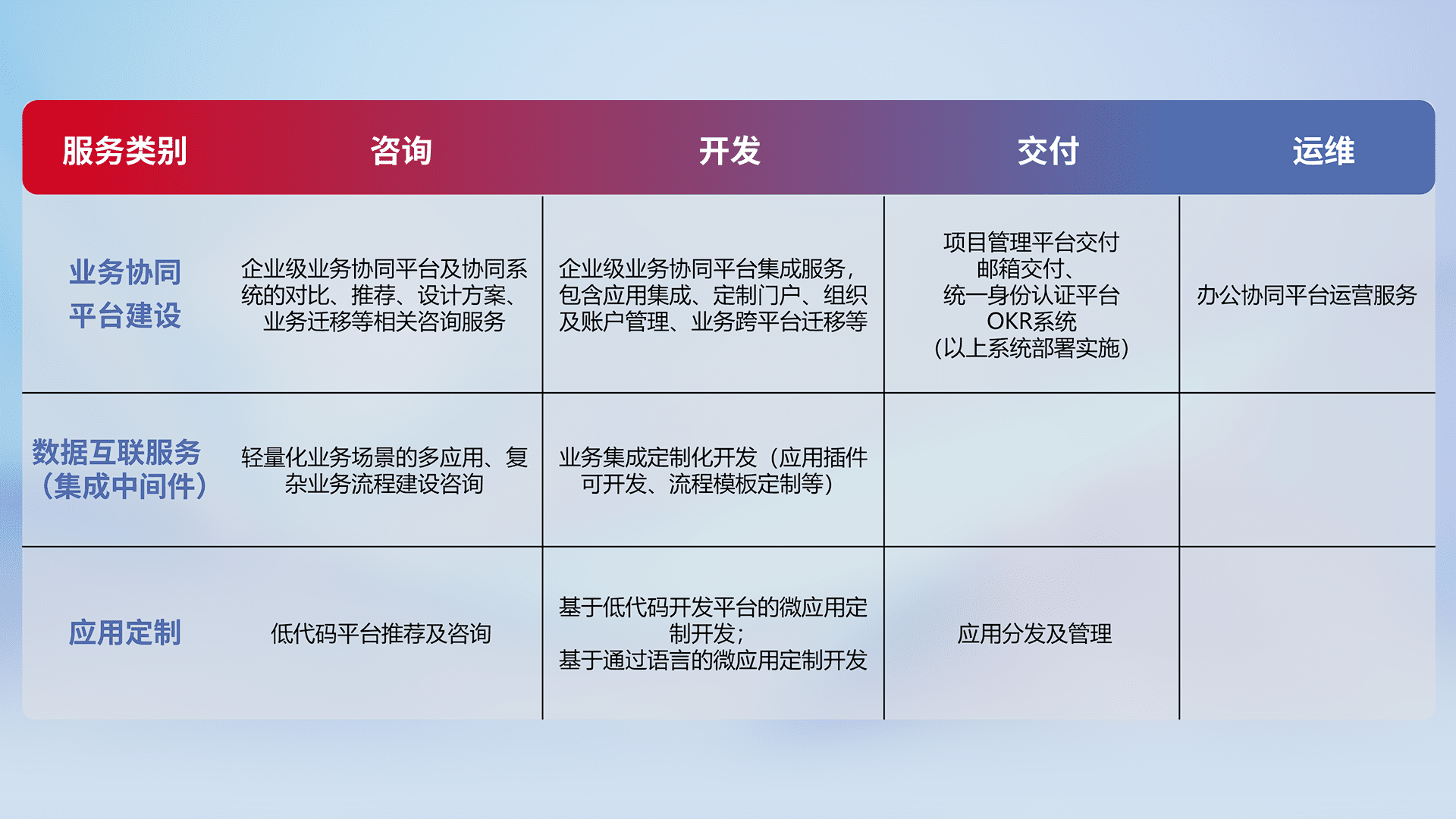 针对钉钉、、企微、、、IDaas等平台级产品提供产品的规划、、、方案、、、交付、、定制化开发等服务,,,实现如统一协同办公、、智能客户服务、、、、混合会议管理、、智能数据查询、、、等业务场景,,,实现数字化转型。。。